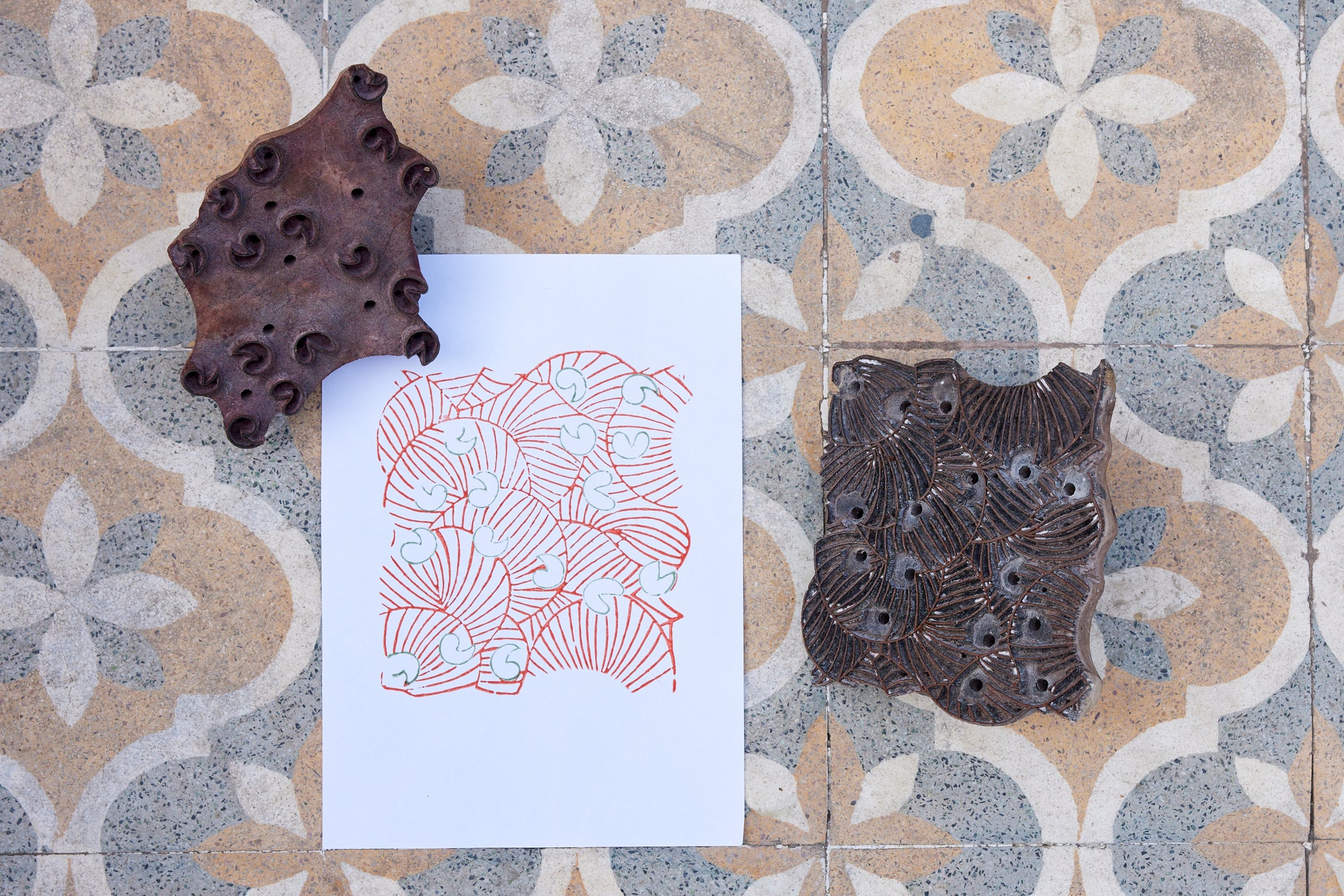 The cushion’s design is hand-pressed onto cotton using hand-carved wooden blocks dipped in dyes. The printed cotton shells are then brought to the homes of sewists who stuff and stitch the pillows by hand, creating the final product.