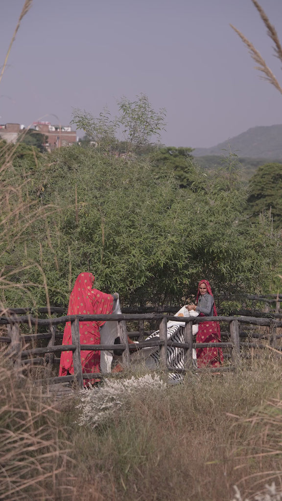 Each quilt is handmade from 100% cotton and requires attention from four artisans, including wood carvers, block printers, quiltmakers, and dye specialists. The design is hand-pressed onto each quilt using hand-carved wooden blocks dipped in dyes. The printed cotton shells are brought to the homes of quiltmakers, who stuff and stitch the quilts by hand, creating the final product.