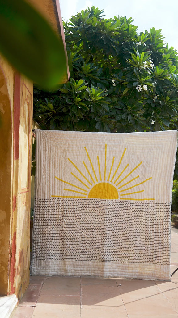 The design is hand-pressed onto each quilt using hand-carved wooden blocks dipped in dyes. The printed cotton shells are brought to the homes of quiltmakers, who stuff and stitch the quilts by hand, creating the final product.