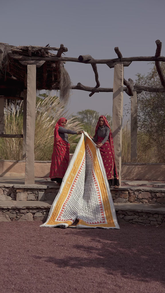 The design is hand-pressed onto each quilt using hand-carved wooden blocks dipped in dyes. The printed cotton shells are brought to the homes of quiltmakers, who stuff and stitch the quilts by hand, creating the final product.