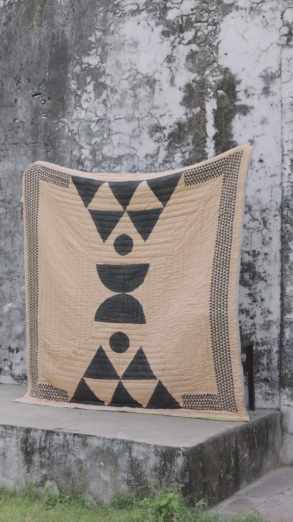 The design is hand-pressed onto each quilt using hand-carved wooden blocks dipped in dyes. The printed cotton shells are brought to the homes of quiltmakers, who stuff and stitch the quilts by hand, creating the final product.