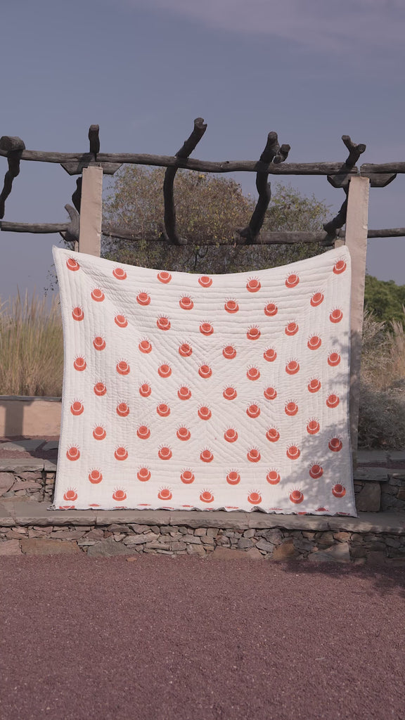The design is hand-pressed onto each quilt using hand-carved wooden blocks dipped in dyes. The printed cotton shells are brought to the homes of quiltmakers, who stuff and stitch the quilts by hand, creating the final product.