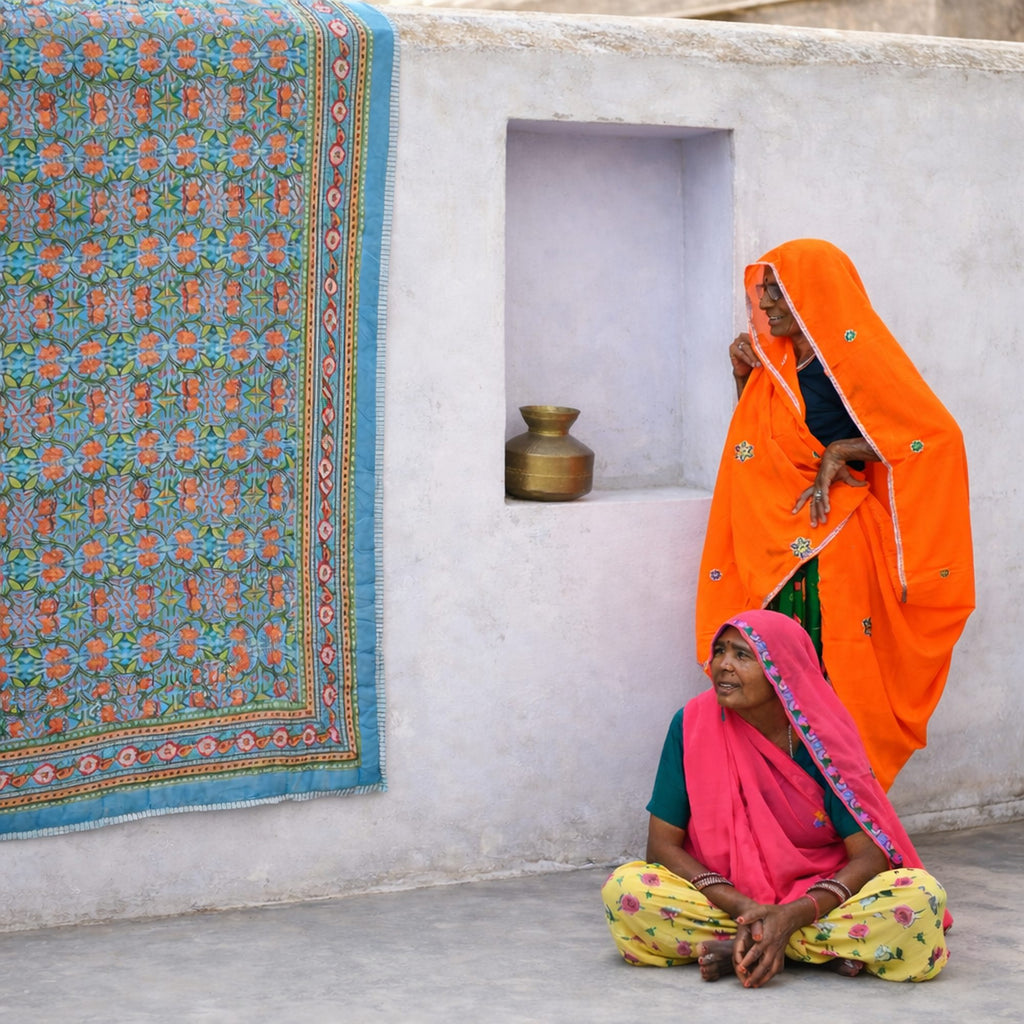 The design is hand-pressed onto each quilt using hand-carved wooden blocks dipped in dyes. The printed cotton shells are brought to the homes of quiltmakers, who stuff and stitch the quilts by hand, creating the final product.